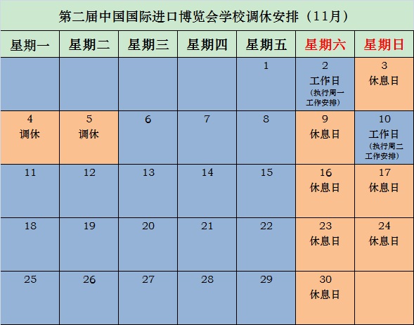 根据《关于调整第二届中国国际进口博览会期间公众休息日安排的通知》(沪府办[2019]113号)、《上海市教育委员会关于第二届中国国际进口博览会期间本市教育系统学校调整休息日安排的通知》(沪教委办〔2019〕50号)的要求,结合学校工作实际,现就第二届中国国际进口博览会期间红足一1世调休作如下安排。