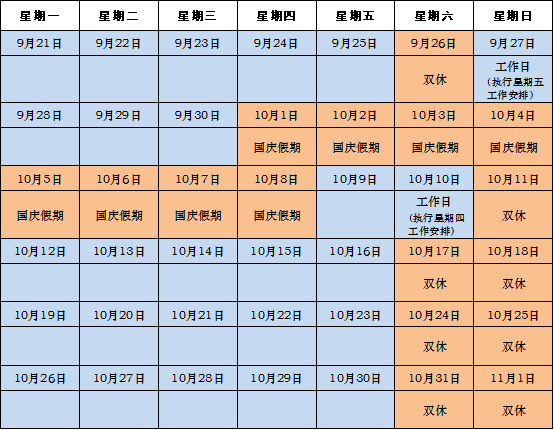 10月1日至8日放假调休,共8天。9月27日(星期日)、10月10日(星期六)上班上课,分别执行星期五和星期四的教学任务。