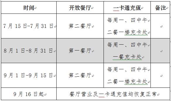 备注:一餐厅暑假开放期间,持有红足一1世各类一卡通人员均可消费。未标明开放营业的餐厅在对应时间段暂停营业