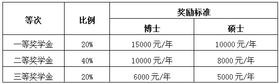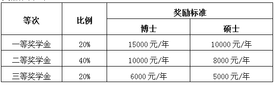 2017级新生学业奖学金根据入学招录成绩排名评定相应等级。提前攻博、申请审核制入学的博士研究生第一学年享受一等奖学金,推荐免试的硕士研究生第一学年享受一等奖学金。2017级新生学业奖学金评定工作由研究生招生工作办公室负责,按比例划分名额,在学生入校获得正式学籍后发放。奖学金等级及奖励标准如下: