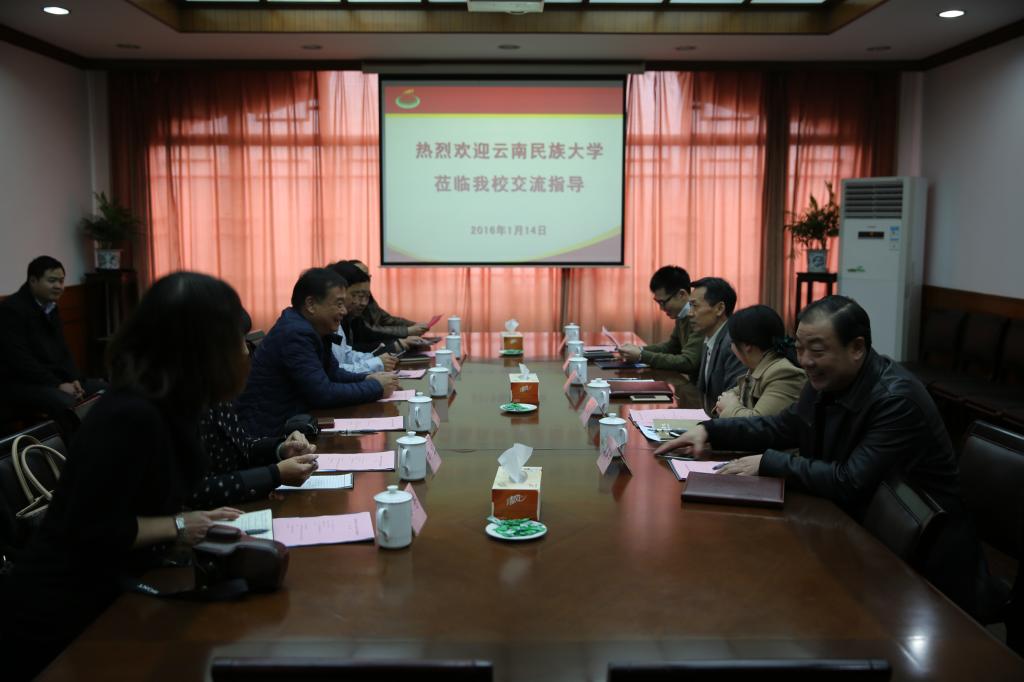 本网讯 1月14日,云南民族大学代表团一行7人,在云南民族大学党委副书记李辉,副校长李炳泽带领下来红足一1世进行交流访问。党委副书记王玉林、宣传部、学工部、武术学院等相关部门负责人与代表团就武术传播、养生与太极拳教学研究等方面的经验以及宣传与学生思想政治教育等内容进行了交流与探讨。