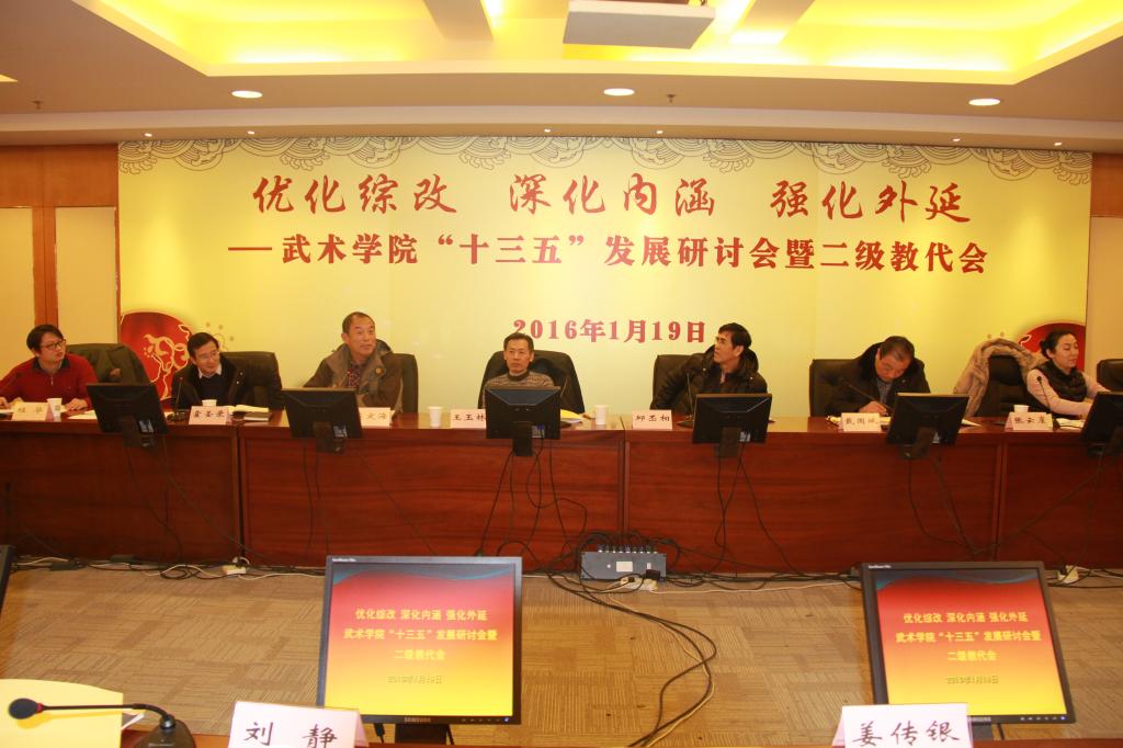 会上,武术学院院长戴国斌就武术学院在“十二五”期间工作成绩进行了总结,并从建设科学研究高地、建设武术教育教学高地、建设武术文化作品创作和推广高地等方面就“十三五”期间的建设目标和发展设想进行了介绍。武术学院党总支书记霍圣录对《上海体育学院武术学院本科教学教室激励计划经费分配办法(讨论稿)》和《武术学院2016年度教职工绩效考核实施细则》进行了介绍与解读。党总支副书记、副院长程华从学生发展视角出发,对提高武术学院本科生学风建设进行了思考,并介绍了《武术学院学生管理条例》。副院长张云崖介绍了武术学院本科教师教学激励计划及本科教学团队建设实施意见,并就2015年度的奖励发放情况进行了介绍。