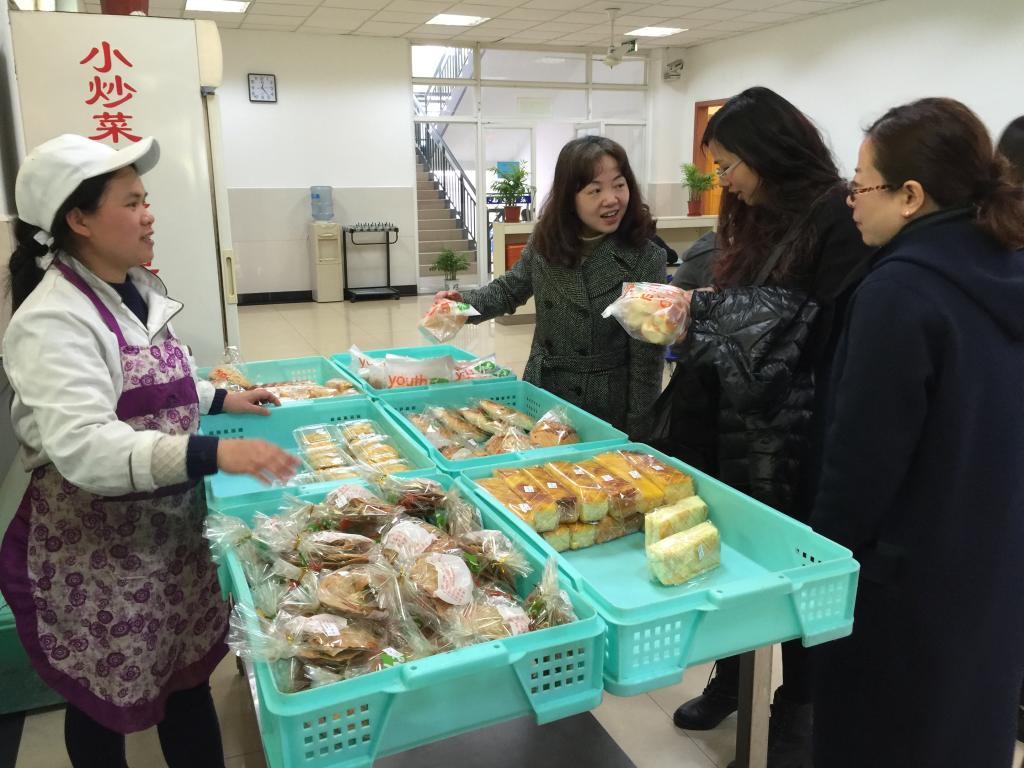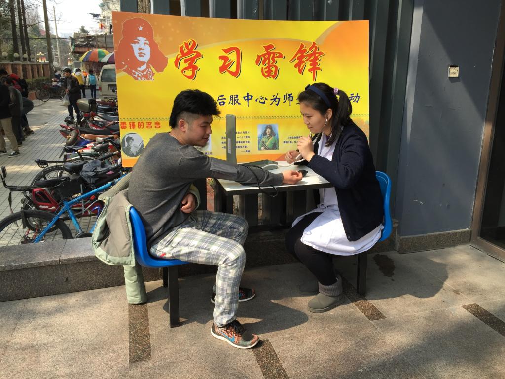 3月2日中午十一点,第三餐厅门口整齐地摆放着一排桌椅板凳和家用电器,宿管部的员工们在这里为全校师生开展衣物缝补、毛衣除毛球、自行车维修、伞具维修、熨烫衣物等服务,设备维护部也搭起服务台,提供电脑简易咨询和维修服务,校园管理部在小商店及第二餐厅门口提供绿植优惠活动,餐饮部在二餐二楼提供面包糕点优惠活动,同时,门诊部还在第二餐厅门口免费为师生量血压,提供医疗咨询服务。