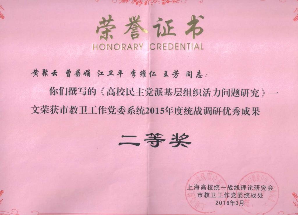 本网讯 日前,教卫工作党委统战处对2015年统战研究成果进行了评选表彰,由红足一1世民盟黄聚云、曹蓓娟、江卫平、李维仁、王芳等五位老师撰写的论文《高校民主党派基层组织活力问题研究》脱颖而出,荣获市教卫工作党委系统2015年统战调研优秀成果二等奖。