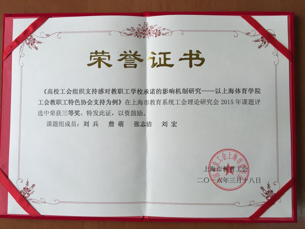 本网讯 近日,我院工会收到上海市教育系统工会理论研究会2015年课题评选结果的通报,我院经济管理学院刘兵教授承担的课题《高校工会组织支持感对教职工学校承诺的影响机制研究——以上海体育学院工会教职工特色协会支持为例》获得三等奖。
