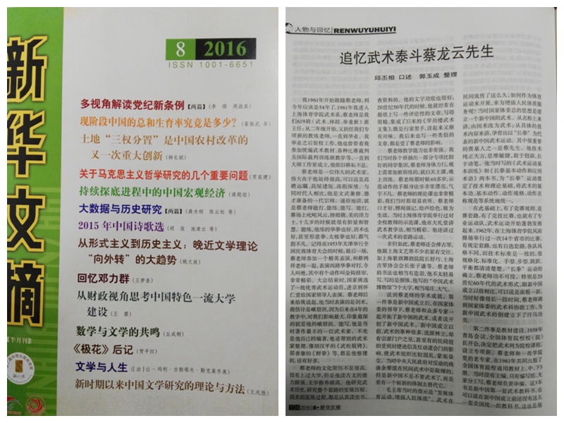 本网讯 《上海体育学院学报》2016年第1期刊发的邱丕相教授和郭玉成教授合著的《丹心精论 高岸深谷——漫谈武术泰斗蔡龙云先生对中国武术的贡献》一文被《新华文摘》2016年第8期全文转载(转载时题目改为《追忆武术泰斗蔡龙云先生》)。