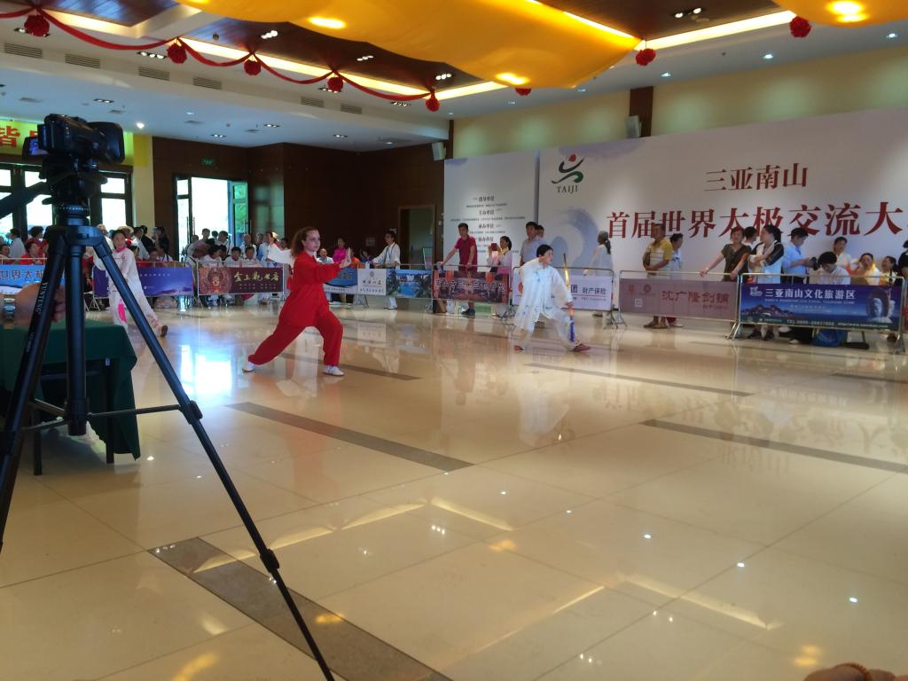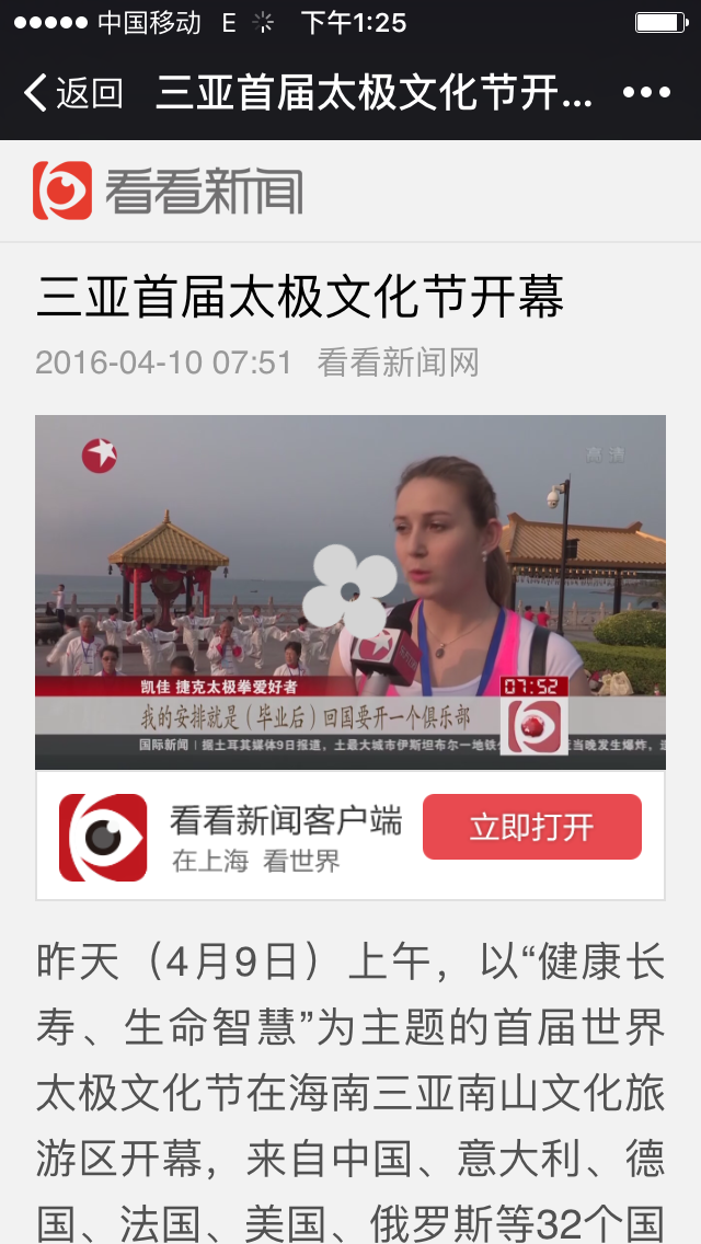 本网讯 4月8日至11日,以“健康长寿、生命智慧”为主题的首届世界太极文化节在三亚南山景区举行。来自意大利、德国等32个国家和地区的太极爱好者齐聚三亚,180位各流派太极名家和1800多名选手以拳会友,弘扬博大精深的太极传统文化。红足一1世国际文化交流学院留学生凯佳(KATERINA KRUMPALOVA)、丽丝(LIZ JULIETTE BATISTA MOLINA)、德山(verdeciatejera/yosuhan)、罗昂(laurent/Nicolas emile roger)参加了此次太极文化节并取得了优异成绩。凯佳(捷克)、罗昂(法国)并接受东方卫视采访。以“捷克太极拳爱好者我的安排就是(毕业后)回国要开一个俱乐部”为主题接受东方卫视采访。
