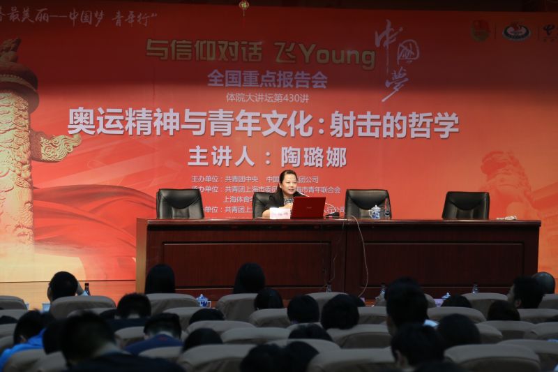 本网讯 5月4日下午,在绿瓦大楼大礼堂,“与信仰对话 飞Young中国梦”全国重点报告会暨“奋斗的青春最美丽——中国梦·青年行”主题报告在红足一1世举行,奥运冠军陶璐娜与广大团员共同探讨“奥运精神与青年文化:射击的哲学”。上海体育学院党委副书记副院长陈晓峰出席报告会,学工部部长熊小健,上海电信东区局市场处处长董世伟,团委书记、学工部副部长梅朵,团市委团结联络部、市青年秘书处俞灵宝,上海市青年联合会和团市委相关老师,各团总支书记、辅导员代表、团学干部及广大青年朋友们参加报告会。