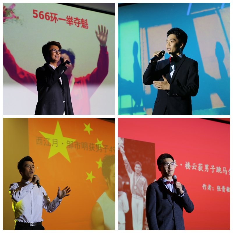 第二章《青春·绽放》由蓝肇熙创作的《七律·邹凯获男子自由体操冠军》引领5首诗词依次登场,赞扬了以邹凯、刘翔、林丹、孙杨、佟文为代表的体育健儿艰苦训练、为国争光的鉴定信念。诗句抑扬顿挫,朗诵铿锵有力,博得台下阵阵掌声。