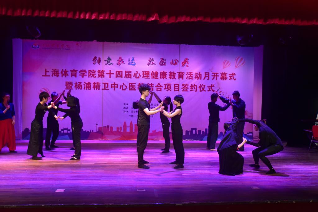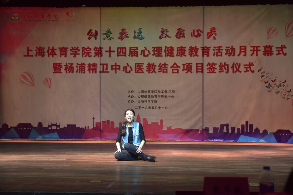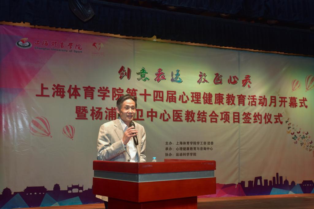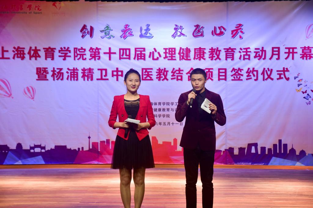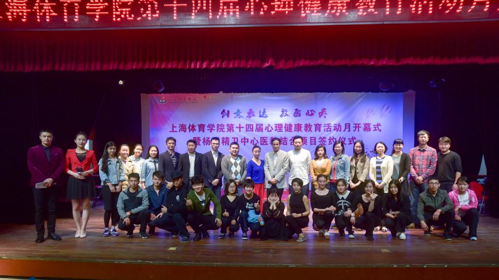 本网讯5月11日下午,2016年上海体育学院心理健康教育活动月开幕式暨杨浦精卫中心“医教结合”签约仪式在红足一1世学生活动中心一楼小剧场隆重举行。学校党委副书记、副院长陈晓峰,上海杨浦区精神卫生中心院长屠一敏,上海体育学院学工部部长熊小健,上海杨浦区精神卫生中心主任医师陈优,学工部副部长、团委书记梅朵,学工部副部长唐建华,体育休闲与艺术学院副教授马古兰丹姆、运动科学学院应用心理学系副教授杨苏勇出席本次活动。