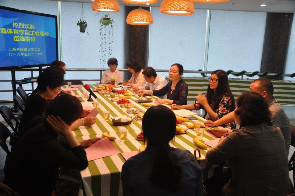 最后,上体工会常务副主席刘宏老师在总结发言中表达了感谢、感动、感触的心情,对上外工会同仁在参与筹备党代会的紧张工作中的热情接待表示感谢,借此机会学到了上外工会许多好的工作做法和好的经验,开阔了视野,为我院今后工会工作的开展拓宽的思路,起到了积极的促进作用。希望两校工会间加强交流,准确把握新形势下工会工作面临的问题和挑战,共同努力创新工会工作,更好地落实党的群团工作会议要求,在新的更高层面做好服务教职工工作。