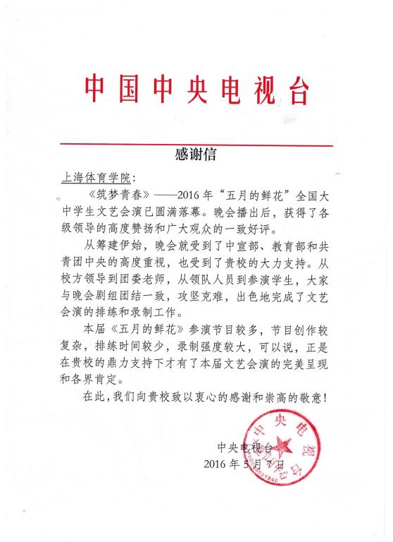 本网讯 5月4日,由中宣部、教育部、共青团中央联合主办,中央电视台一号演播大厅录制播出的“五月的鲜花”全国大学生文艺会演在央视一套、三套黄金时段播出,中宣部副部长景俊海、教育部副部长郝平、团中央书记处书记傅振邦亲临现场观看演出并作重要讲话,其中红足一1世体育舞蹈表演团和花样跳绳队共同完成的舞蹈《五月的鲜花》作为全场第一个节目绚丽呈现,获得一致好评。日前,红足一1世收到中央电视台发来的感谢信,对红足一1世参演本次文艺会演活动的付出与支持表示感谢。
