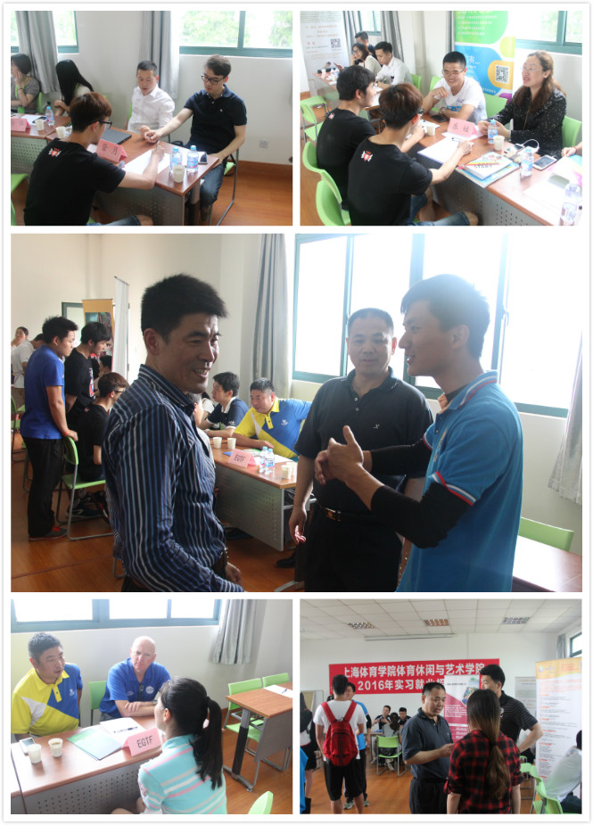 校企联动,举办实习就业招聘会和人才供需交流会,为学生有效落实单位搭建平台。6月8日下午,体育休闲与艺术学院在高尔夫球场三楼举办了2016年实习就业招聘会。休艺学院党政班子、各教学团队负责人及17届毕业生参加了本次招聘会。此次招聘会吸引了包括上海跃动文化传播有限公司、上海棒棒贝贝教育咨询有限公司、小荧星、上海迈伽健身管理有限公司等近20家关于户外拓展、高尔夫培训、青少年艺术培训和健身健美相关的企业来校进行宣讲及招聘。招聘会上,同学们纷纷主动出击,把握机会,对感兴趣的职位进行详细了解;用人单位也全心投入,不仅为前来咨询的同学耐心讲解,还为同学们准备了宣传页,让同学们深入地了解用人单位的同时,做出正确合理的选择。招聘会后,休艺学院参会教师又与各公司代表就人才培养、课程设置、实习实践、社会服务等方面进行了全面的交流与沟通。