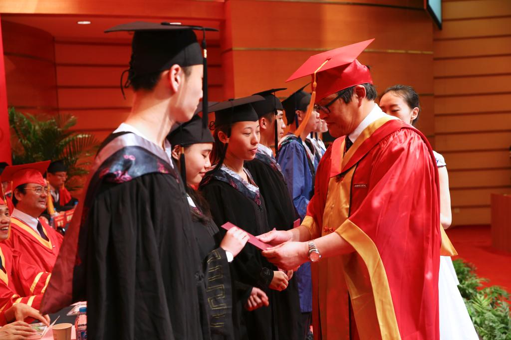 典礼结束后举行了学位授予仪式,校领导为毕业生拨苏正冠,颁发学位证书并合影留念。