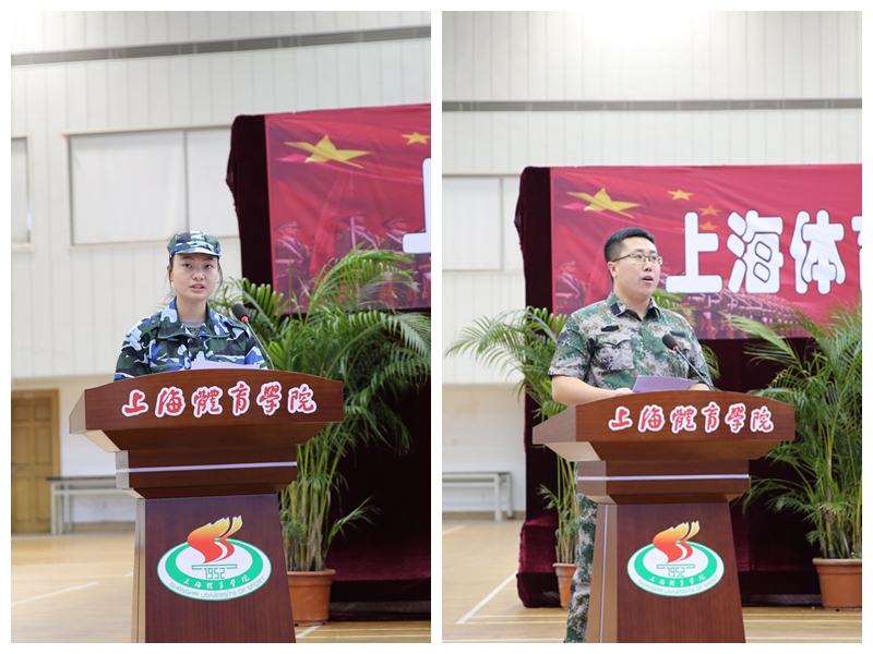 来自体育教育训练学院的学生代表屠佳莲上台发言。她代表全体受训学生表达了坚决完成军训任务的决心。她表示,“天将降大任于斯人也,必先苦其心志,劳其筋骨”,我们只有不畏艰险,迎难而上,才能真正将吃苦耐劳的优秀品质带入生活,并将“身心一统、兼蓄竞攀”的校训落实到实践中。来自运动科学学院的刘云龙作为教师代表上台发言。他回顾了绿瓦书写民族沉浮的历史,强调绿瓦人“勿忘国耻、富国强兵”的使命。他认为,我们应以军人的身份要求自己,戒骄戒躁,在军训中得到真正的磨砺。全体军训指导员将积极配合军训团及学校各职能部门的工作,严格要求、科学管理,让参训学生通过军训得到真正的锻炼,更向部队官兵展现“军民鱼水一家人”的真情厚谊。