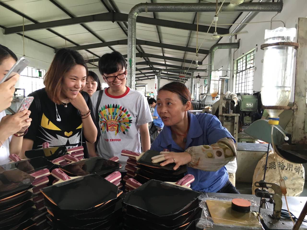 参观完乒乓球制作后,杨总带大家参观了胶皮和成品拍的制作。同样也有很多程序与步骤,同学们不由得感叹以前只会打乒乓球,没想到乒乓球器材的制作这么复杂和精细化,尤其是制成胶皮的橡胶气味让人难以忍受,不得不佩服工作在基地的工人们,参观完后更让同学们懂得珍惜乒乓球器材。