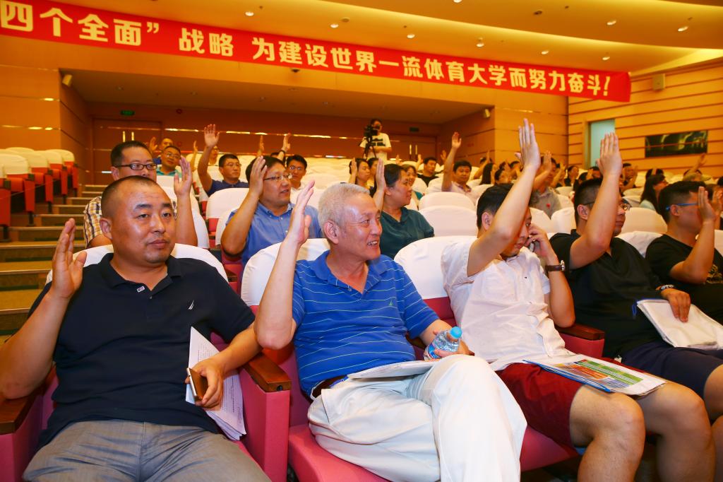 大会号召,围绕学校“十三五”改革和发展任务,认真实施跟踪评估,具体分解工作任务,确保实现建设目标,积极推进民主管理和依法治校的进程,解放思想、坚定信心、团结奋进、抓住机遇,为建设世界一流体育大学而奋斗!