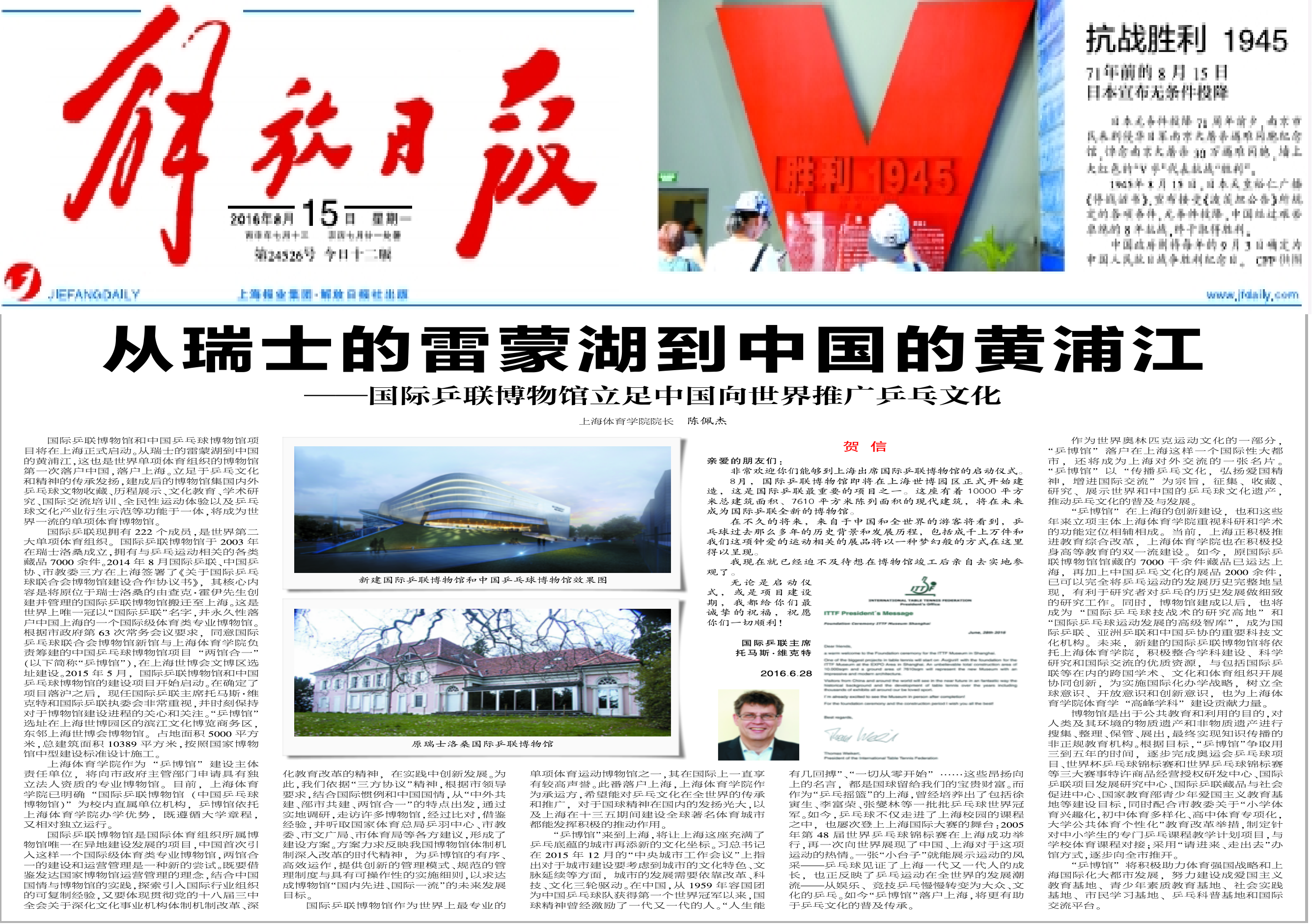 本网讯 8月15日,《解放日报》、《文汇报》分别以专栏形式刊登了国际乒联博物馆和中国乒乓球博物馆(简称“乒博馆”)建设背景、国际乒联主席托马斯先生贺信、展馆内部分藏品介绍、藏品征集公告和上海体育学院院长陈佩杰署名文章——《从瑞士雷蒙湖到中国黄浦江——国际乒联博物馆立足中国向世界推广乒乓文化》。