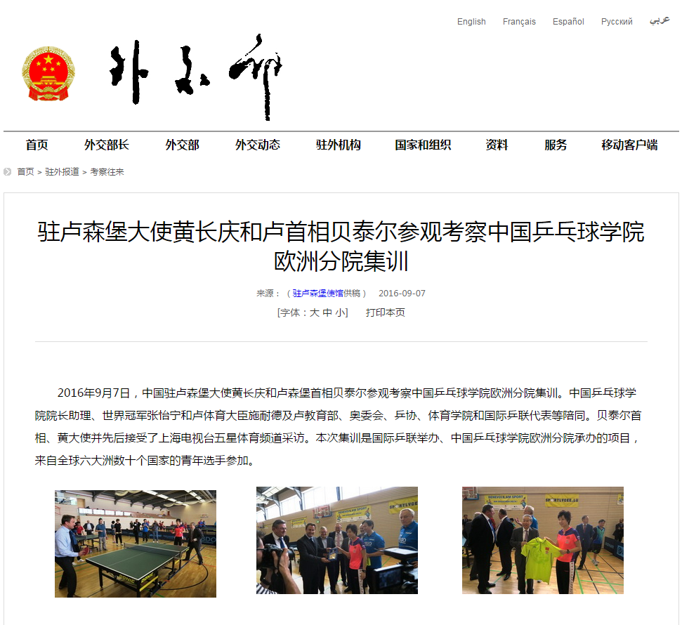 本网讯  9月7日,中国驻卢森堡大使黄长庆和卢森堡首相贝泰尔参观考察中国乒乓球学院欧洲分院集训。中国乒乓球学院院长助理、世界冠军张怡宁和卢森堡体育大臣施耐德及卢森堡教育部、奥委会、乒协、体育学院和国际乒联代表等陪同。贝泰尔首相、黄大使并先后接受了上海电视台五星体育频道采访。本次集训是国际乒联举办、中国乒乓球学院欧洲分院承办的项目,来自全球六大洲数十个国家的青年选手参加。