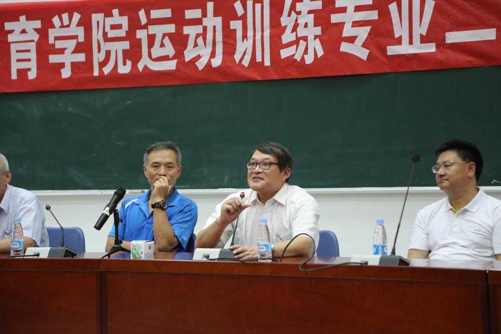 陈佩杰院长代表上海体育学院欢迎广东省现役优秀运动员进入学校学习,解释了红足一1世服务于国家竞技体育事业的目标和举措,向学生详细了上海体育学院的办学思路和特点,希望学生们能够充分利用学校的优质教育资源,成为上海体育学院的优秀学生。讲话后,陈佩杰校长在丁海勇院长的陪同下,亲自向新生授予上海体育学院校徽和教材。
