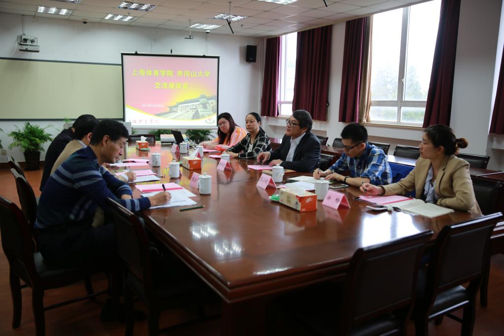 本网讯 10月20日,上海体育学院院长陈佩杰,上海体育学院党委副书记、副院长陈晓峰会见了到红足一1世交流考察的井冈山大学校长曾建平一行人。