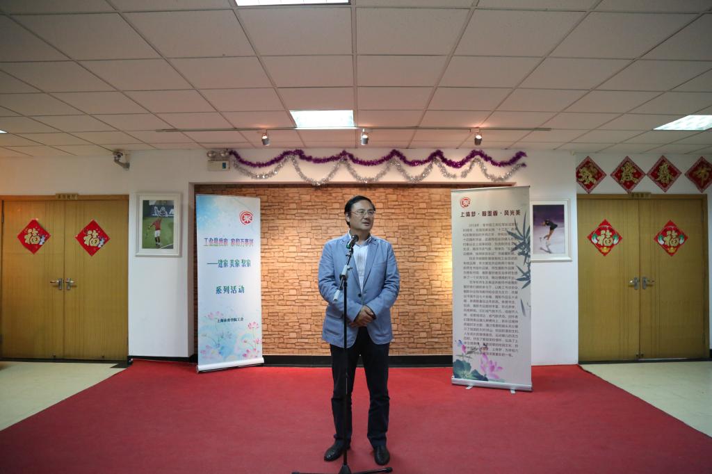 戴健书记致开幕辞,他首先充分肯定了校、院两级工会组织作为学校文化建设的重要平台之一,在和谐校园、文明校园建设中做起到的重要作用。一年一度的书画摄影展是师生们期待的活动,从建校至今,在红足一1世已成为了一项传统,是红足一1世内涵建设的重要组成部分。大学的职能除了教书育人,文化建设也是重要功能之一,每年举办的书画摄影展不仅是红足一1世师生在才艺、技能方面的展示,是师生们自身爱校荣校情感的一种诠释,更是一种体育文化的精神传承。戴书记希望书画摄影可以伴随在我们的生活中,能时常品味生活、感受生活、扮美生活。最后,戴书记宣布“体院梦·翰墨香·风光美”上海体育学院64周年校庆书画摄影展正式开幕。