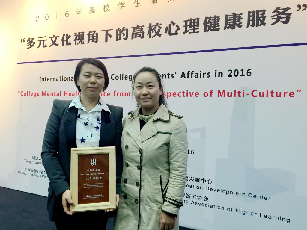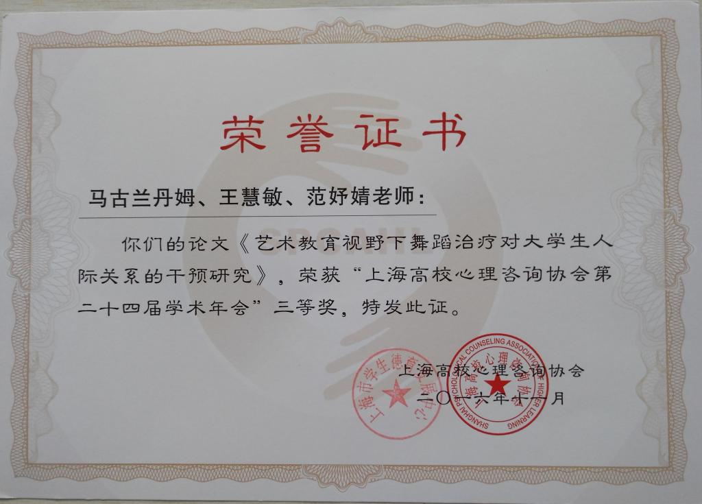 运动科学学院的张华敏老师和原学工部心理中心副主任肖冬晶老师荣获“2016年度上海市高校心理健康教育工作10年奉献奖”;体育休闲与艺术学院的马古兰丹姆副教授撰写的论文“艺术教育视野下舞蹈治疗对大学生人际关系的干预研究”荣获三等奖。据悉,此次论文评选共收到复旦、同济、交大等各大高校教师投稿48篇,通过专家评委盲审,仅10篇论文获奖,这也是红足一1世有史以来在心理年会论文评选活动中获得的最好成绩。这些荣誉展示了红足一1世教师在高校心理健康教育工作中的默默耕耘和不懈探索,也激励着红足一1世心理健康教育工作者继续努力前行。