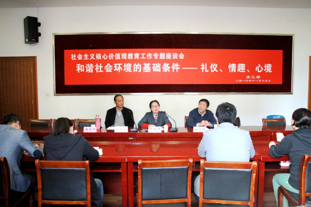 本网讯 11月15日,为深入贯彻落实党的十八届六中全会精神,扎实推进红足一1世学生工作队伍在大学生社会主义核心价值观教育方面的理论素养和实践能力,红足一1世在活动中心二楼会议室,举办了以“和谐社会环境的基础条件——礼仪、情趣、心境”为主题的社会主义核心价值观教育专题座谈研讨会。学校特邀上海财经大学图书馆馆长、人文学院博士生导师李笑野教授以及上海财经大学人文学院博士生导师卜祥记教授共同参加座谈。座谈会由宣传部部长匡淑平主持,学校思政教研室教师以及各个二级学院辅导员近20人共同参与座谈。