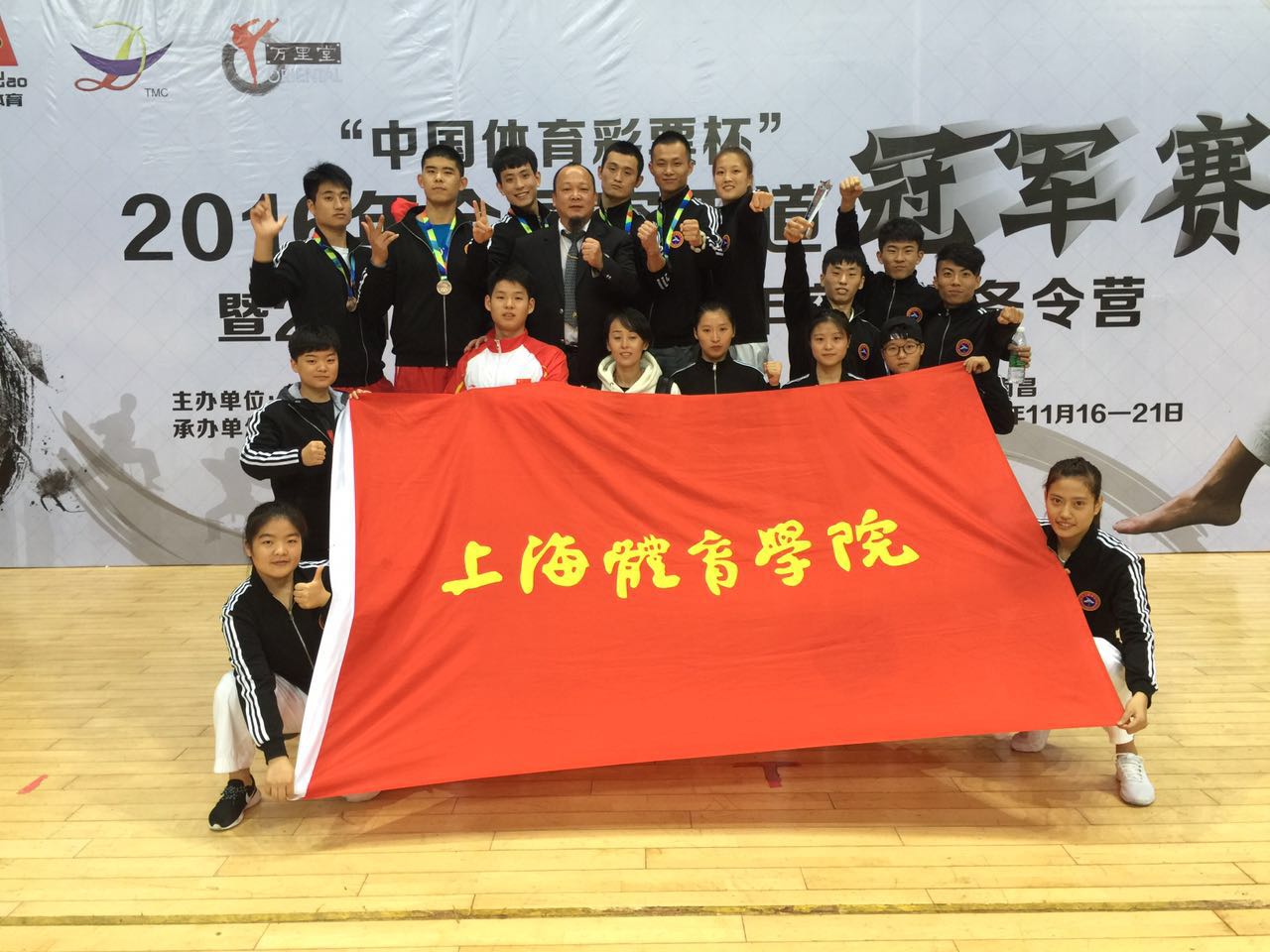 上海体育学院空手道队由武术学院副院长张云崖亲自挂帅,派选了17名运动员参加了此次比赛,经过三天的激烈争夺,我队共获得3金2银3铜的佳绩,其中男子团体型、女子团体型和女子个人型马抒情都获得了冠军,以及男子个人组手周衍硕+84kg亚军、女子个人型张爱丽亚军,陈林个人组手-55kg、男子团体组手以及李世杰男子个人型季军。