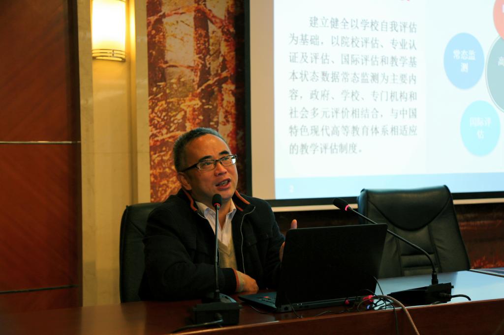 上海大学是第一所接受本科教学工作审核评估的上海市属高校,辛明军教授参与了整个审核评估工作全过程,对该项工作进行了深入的实践与探索,有着独到的见解和深刻的体会。讲座从审核评估工作的指导思想、评建目标与思路、组织机构与职责、二级学院评建工作、评估过程回顾以及问题与建议等六个方面入手,强调审核评估工作的复杂性、紧迫性以及重要性。本科教学工作审核评估要求贯彻落实教育规划发展纲要和上海市教育综合改革方案,以现代评估理论为依据,坚持“以评促建、以评促改、以评促管、评建结合、重在建设”的方针,突出内涵建设和特色发展,强化办学合理定位和教学中心地位,强化质量保障体系建设,促进每一个学生的终身发展,不断提高人才培养质量。辛教授强调,评建总体思路要体现与时俱进、改革发展以及常态长效,特别是二级学院的评建工作是重中之重。