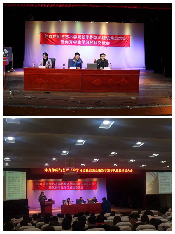 本网讯 3月8日下午,体育休闲与艺术学院新学期学风建设动员大会暨优秀学生学习经验交流会在学生活动中心小剧场圆满落幕。休艺学院党政领导、辅导员以及大一、大二全体同学参加了本次活动。
