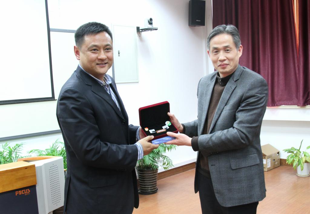 在欢送会上,陈晓峰向即将出征的孙伟老师赠送了纪念品以及带有校徽、团徽、小火炬徽章和官微二维码的一份特殊的纪念徽章盒。