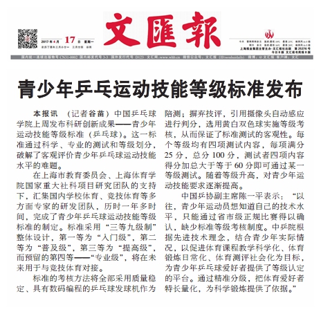 3.文汇报2017-4-17第7版青少年乒乓运动技能等级标准发布