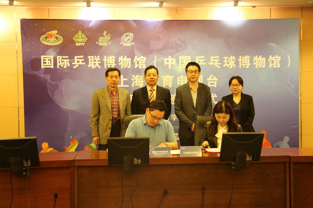 本网讯 4月21日,国际乒联博物馆和中国乒乓球博物馆与上海教育电视台在上海体育学院图文信息楼第一会议室举行了战略合作签约仪式,上海体育学院党委副书记王玉林、上海开放大学党委副书记王连华、上海体育学院副院长、中国乒乓球学院院长施之皓,上海体育学院宣传部部长匡淑平、国际乒联博物馆(中国乒乓球博物馆)副馆长顾郑军、上海教育电视台常务副台长陆生以及上海教育电视台和国际乒联博物馆(中国乒乓球博物馆)的工作人员参加了此次会议。