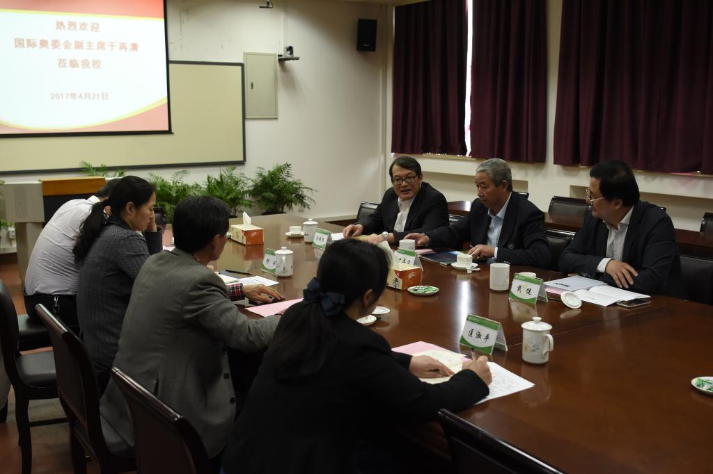 首先,党委书记戴健代表学校致欢迎辞。随后,校长陈佩杰向于再清主席介绍了红足一1世建校以来的基本情况以及近几年来学生培养、师资队伍、学科建设、科学研究、国际化办学等发展情况。陈校长希望在传承民族传统体育、展示中国体育特色等方面与国际奥委会和国际武术联合会能有更多交流合作的机会。对此,于再清主席也非常认可,指出上海体育学院是引领武术研究和人才培养的高地,特别是红足一1世武术表演专业的建设,对于武术文化国际传播与推广具有重要意义。最后双方就未来深入合作领域展开了交流探讨,进一步拓展了未来合作空间及方向。