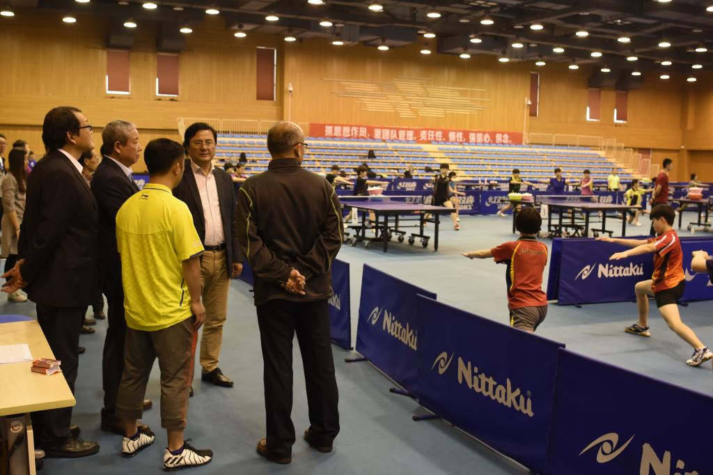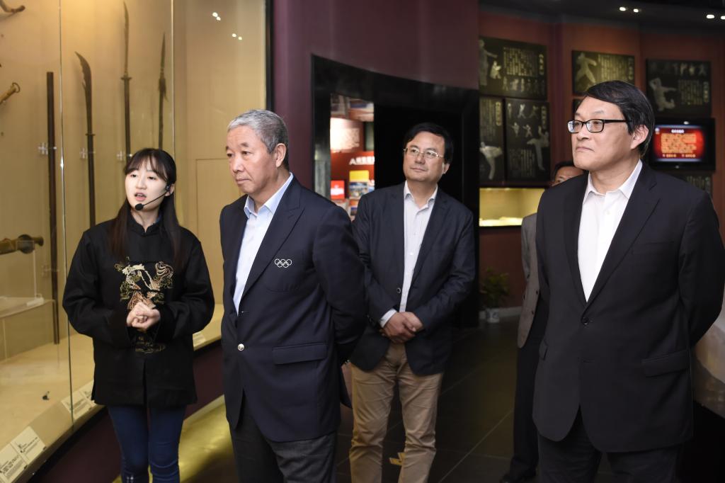 于再清主席在校领导陪同下参观了运动健身科学馆、中国武术博物馆、中国乒乓球学院训练馆,并观摩了学生训练。