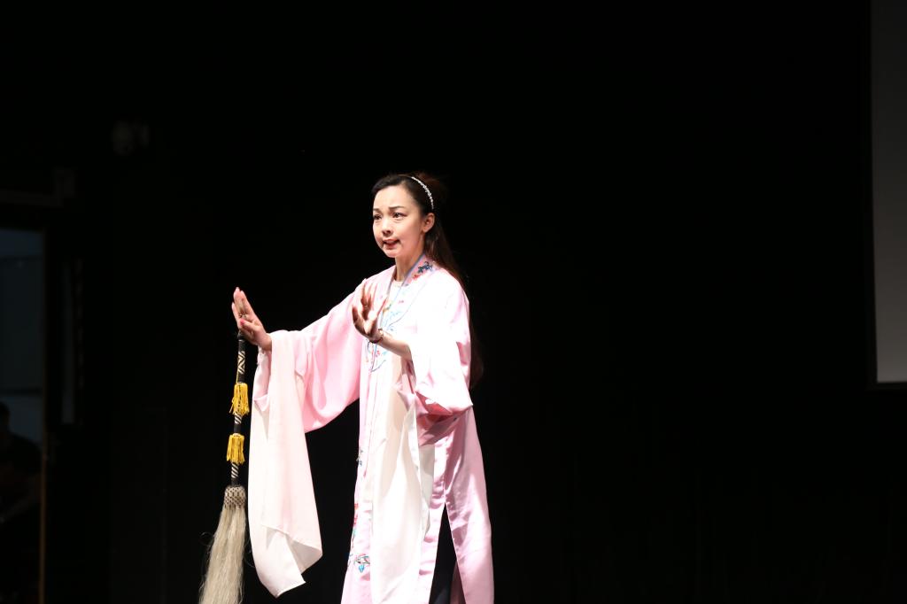 为了让同学们更好的领略到昆曲的魅力。谷好好老师分别邀请了上海昆剧团三、四、五代的艺术家,侯哲、汤泼泼等几位老师为我们带来了《牡丹亭》、《孽海记》选段的表演,并邀请了现场的观众一起学唱昆曲。