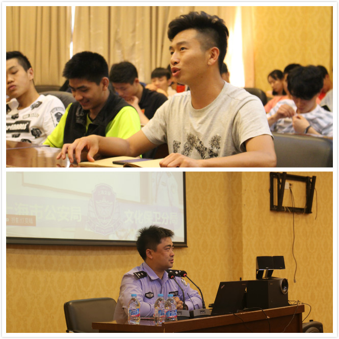在主题教育中,谢警官还从学习区、生活区的各类防盗工作以生动的视频案例让同学们进一步提高安全防范意识。随后,谢警官在和同学们互动中对部分学生遇到的电信电话诈骗等实际情况一一作了具体的分析与交流,赢得了同学们一次次热烈的掌声。