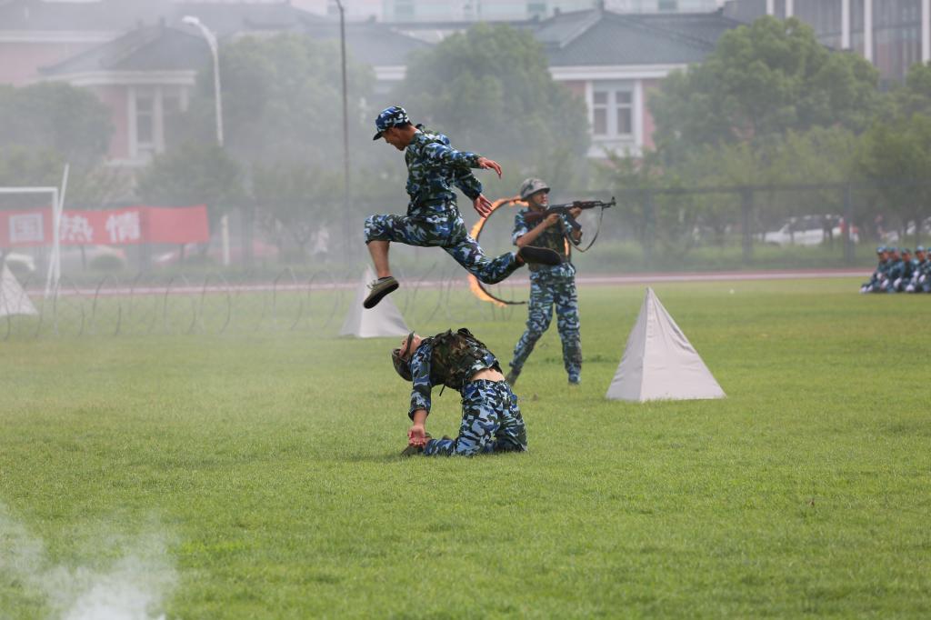 阅兵式后,军训汇报表演开始。首先出场的是女子军体拳方阵,她们气宇轩昂,英姿勃发,一招一式柔中带刚,大有“巾帼不让须眉”的气势。随后是男子刺杀操表演,上体男儿们眼神凌厉、招式逼人、喊声响彻云霄,将军人的正气和霸气完美结合。最后是步兵班进攻战斗演练,战士们脸涂迷彩图案,匍匐前进、钻火圈、搏斗摔跤,再现烽火岁月,展现出勇猛果敢、不屈不挠的顽强意志,博得在场所有人的阵阵喝彩。