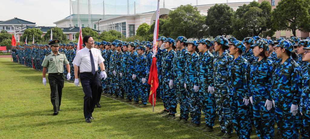 大会在庄严的《中华人民共和国国歌》声中拉开序幕。迎团旗仪式后,阅兵指挥、军训团参谋长闫振东向校党委书记戴健做出报告。随后军训团团长孙强、校党委书记戴健和校党委副书记、副院长陈晓峰对所有参加阅兵式的队伍进行检阅。检阅完毕,各支队伍开始分列式表演,各连队依次踏着军歌乐曲,迈着整齐的步伐经过主席台前,以饱满的精神和昂扬的斗志接受领导的检阅。用实际行动向辛勤付出的教官、指导员们致敬,传承绿瓦学子的“竞攀”精神。