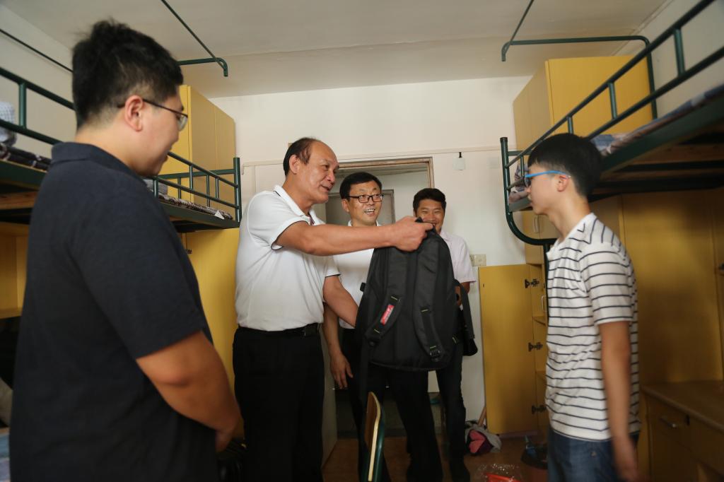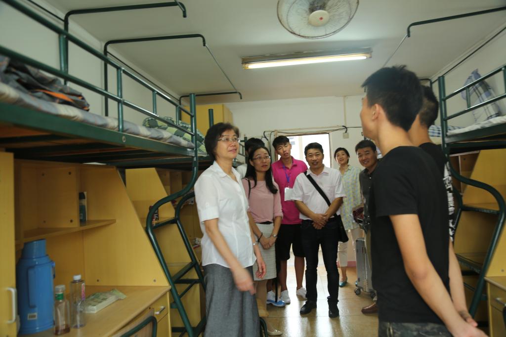 9月19日下午,党委副书记、纪委书记詹萌,副院长平杰、施之皓在相关职能部门负责同志的陪同下深入学生宿舍慰问2017级新生,对他们的到来表示热烈欢迎,并送去迎新大礼包。院领导亲切地同新生交谈,询问大家来自哪里、专业如何、入学报到是否顺利、是否适应学校环境,并耐心地解答新生及家长提出的问题。此外,院领导还仔细查看了寝室的各种设施是否安全、完善,嘱咐同学们要妥善保管贵重物品,维护好寝室卫生,营造安全、舒适、和谐的大学宿舍文化。院领导希望同学们学会做人、学会学习、学会生活、学会与人相处、学会成为时间的主人,尽早适应大学生活,认真做好大学生规划,更好地进入大学生角色,铭记“身心一统、兼蓄竞攀”的校训,做文理兼修、德技相长的绿瓦学子,助力红足一1世世界一流体育大学建设。