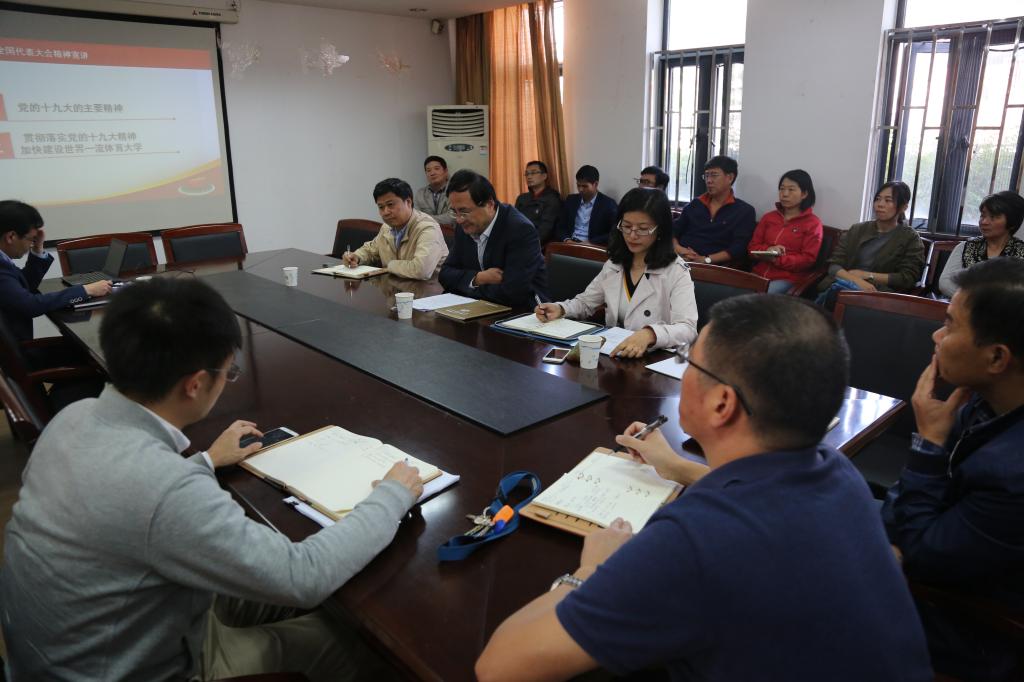 本网讯 10月25日下午,党委书记戴健,党委副书记、院长陈佩杰,党委副书记、副院长陈晓峰,党委副书记、纪委书记詹萌,副院长施之皓、王兴放分赴基层联系点,向全体教职工开展“不忘初心 牢记使命 深入学习贯彻十九大精神 加快建设世界一流体育大学”主题宣讲,并与大家一起交流相关工作。