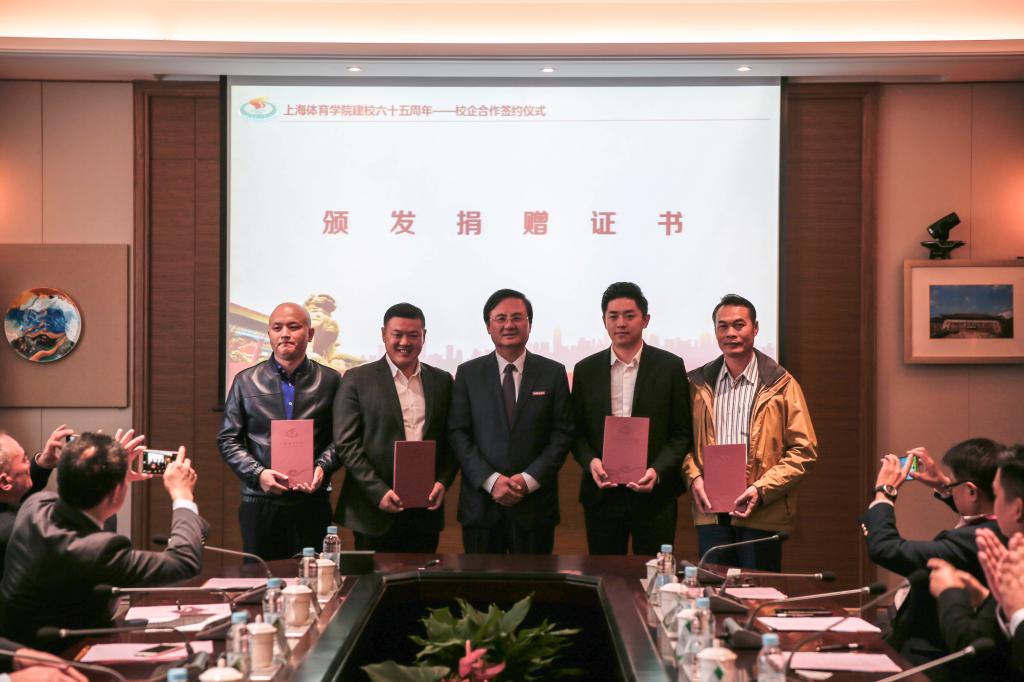 上海体育学院党委书记戴健分别向上海巅峰体育管理股份有限公司、尚体健康科技(上海)股份有限公司、上海紫竹置业(集团)有限公司、广西宁汇吉源输电铁塔有限公司四家企业颁发捐赠证书。