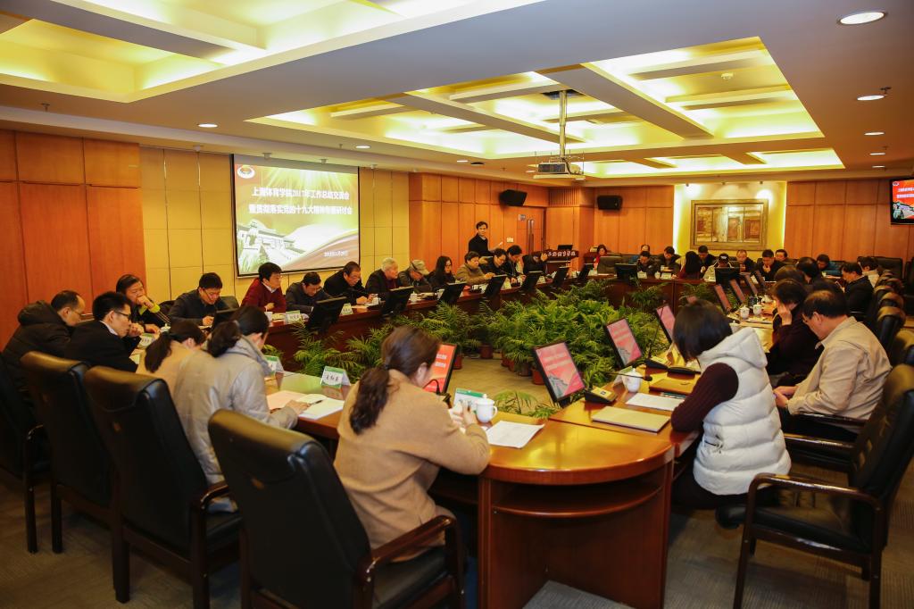 本网讯 1月29日下午,上海体育学院2017年工作总结交流会暨贯彻落实党的十九大精神专题研讨会在图文信息楼第一会议室召开。会议主题为“贯彻落实党的十九大精神,推动学校‘双一流’和上海高水平地方高校建设”。党委书记戴健主持会议并讲话,党委副书记、院长陈佩杰作主题报告,党委副书记、副院长陈晓峰,党委副书记、纪委书记詹萌,党委副书记潘勤,副院长平杰、施之皓、毛丽娟、王兴放出席会议。