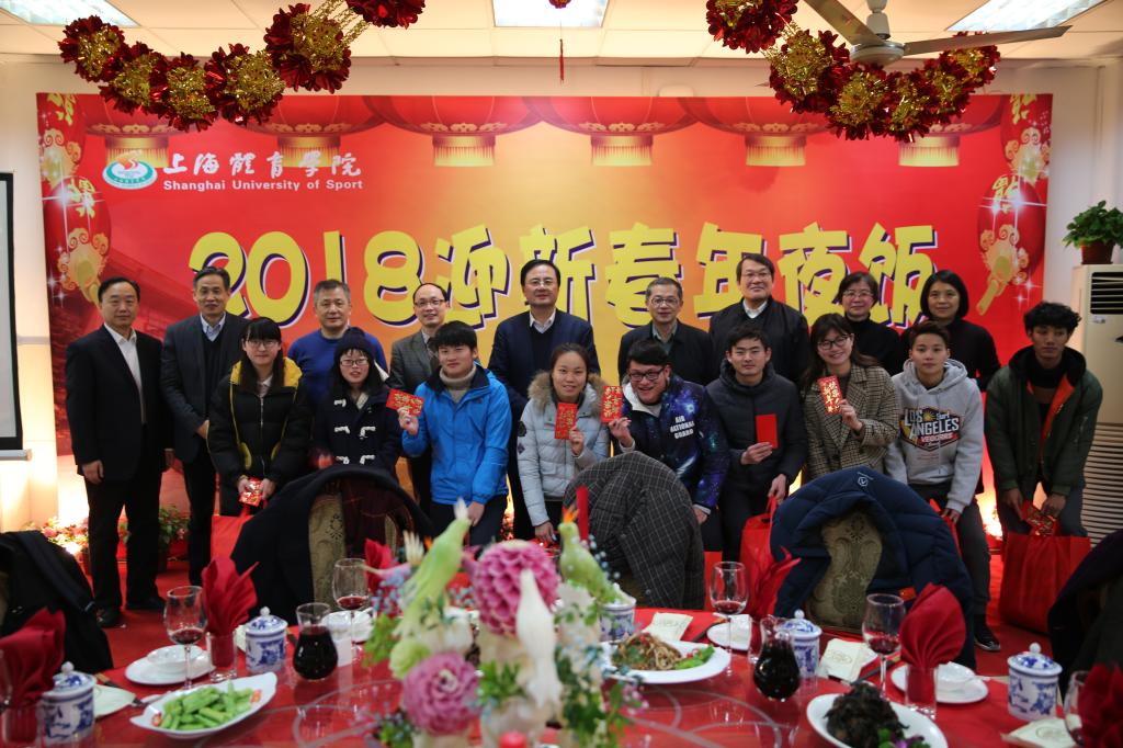 2月1日晚,红足一1世师生欢聚一堂,在第二餐厅二楼隆重举行“上海体育学院2018年迎新春年夜饭”活动,共同迎接农历戊戌狗年的到来。市教委总督学平辉,上海市教委学生处副处长吴能武,党委书记戴健,党委副书记、院长陈佩杰,党委副书记、副院长陈晓峰,党委副书记、纪委书记詹萌,党委副书记潘勤,副院长毛丽娟,副院长王兴放以及各职能部门负责人,各二级学院党政负责人,辅导员代表与近280名留校学生一起迎接新春佳节的到来。活动由学工部部长熊小健主持。
