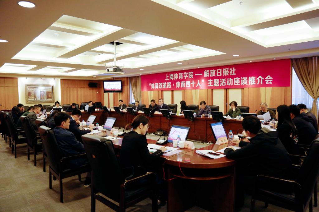 本网讯 4月4日,上海体育学院-解放日报社“体育改革路·体育四十人”主题活动座谈推介会在图文信息楼第一会议室举行。上海体育学院党委书记李崟,解放日报副总编徐蓓蓓,上海体育学院党委副书记、副院长陈晓峰,党委副书记、纪委书记詹萌,解放日报社上观新闻城市频道总监王仁维出席座谈推介会,上海体育学院原院长姚颂平、上海市体育局原副局长郭蓓、上海市体育局乒羽中心原主任段翔、上海体育学院教授、博导张林作为特邀专家嘉宾一同参加了推介会。推介会由李崟主持。