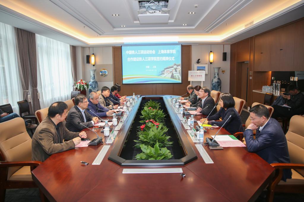 陈佩杰与中国铁人三项运动协会主席张健签署《关于共建中国铁人三项学院的协议》并进行揭牌。体育休闲与艺术学院院长李海对中国铁人三项学院的筹建情况做了介绍。