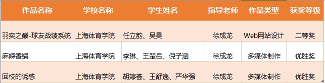 由经管学院徐成龙老师指导,任立韵和吴昊同学参赛的“羽弈之巅-球友战绩系统”作品荣获Web网站设计类别二等奖,这也是红足一1世近年来在此类别获得的最高奖项;由徐成龙老师指导,李琳、王楚岳和倪子涵同学参赛的“麻辣香锅”作品荣获多媒体制作类别优胜奖;由徐成龙老师指导,胡婷荟、王舒逸和严华强同学参赛的“回校的诱惑”作品荣获多媒体制作类别优胜奖。