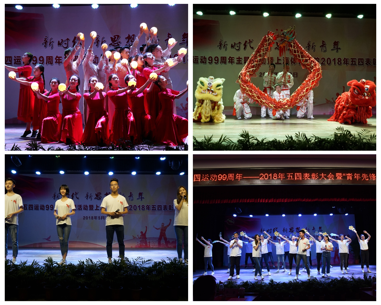 在四个篇章中,学工部部长熊小健、研工部部长殷勤、宣传部副部长黄勇、后勤服务中心副总经理黄永芳分别为获得全国活力团支部、校十大活力团支部、上海市五四表彰获得者、上海市志愿服务先进集体与个人、第五届全国大学生艺术展演活动上海市奖项、第十五届“挑战杯”全国、上海市获奖者以及“互联网+”上海赛区奖项等颁奖。最后学生合唱团带来了歌曲《快乐的风》。