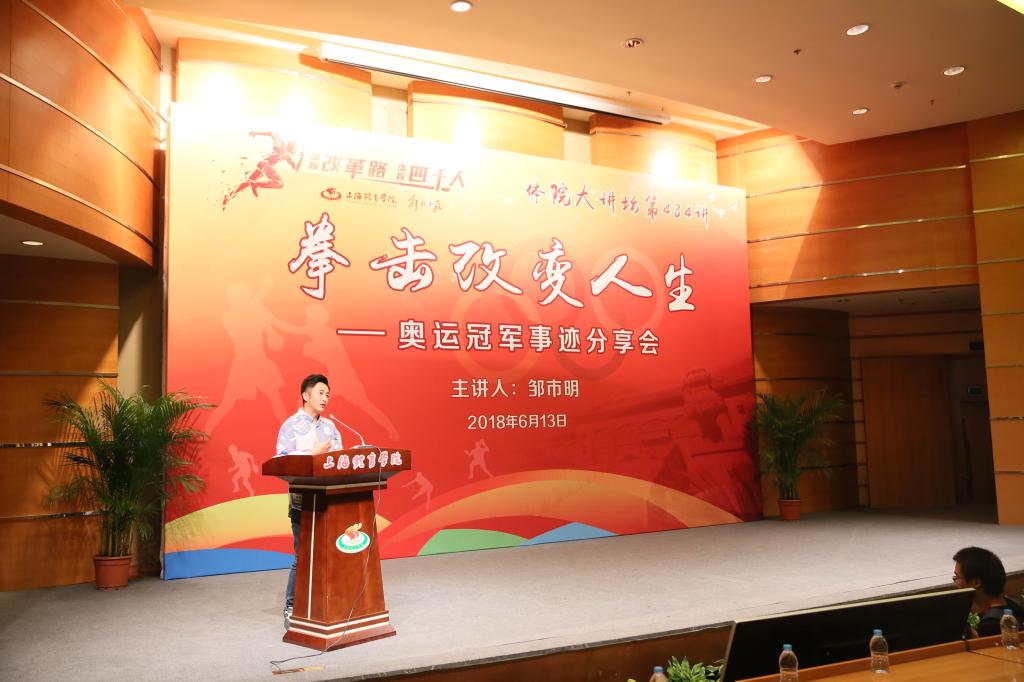 2018年,适逢我国改革开放40周年,也是上海体育学院复校40周年。上海体育学院、解放日报社、上海市体育局以习近平新时代中国特色社会主义思想为指导,合作开展纪念改革开放四十周年“体育改革路,体育四十人”主题系列活动。本次奥运冠军邹市明事迹分享会,也是通过邹市明的亲身讲述,通过拳击的传奇职业生涯使上体师生深入了解改革开放背景下中国体育的发展历程,深入理解当今体育人的责任与担当。